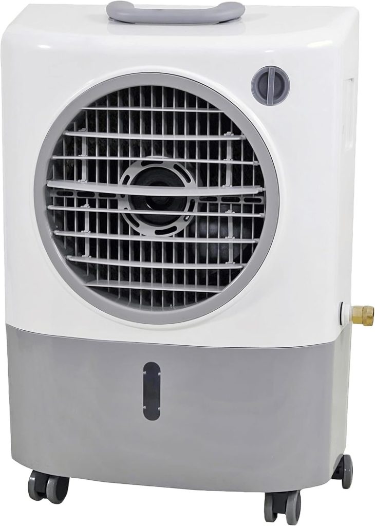 | NewAir 470 CFM Evaporative Cooler | Up to 250 sq ft | ~7.5 L (2.0 gal) | Moderate (~66 dB max) | 470 CFM, 3 speeds, timer, remote, easy-glide wheels |
