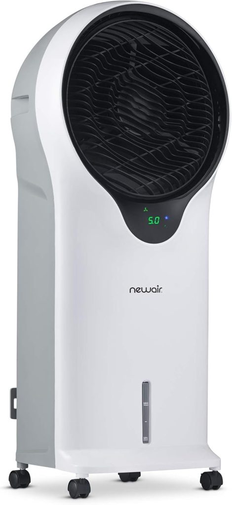 The NewAir 470 CFM evaporative cooler is a mid-sized unit with solid cooling performance suitable for bedrooms or small living areas up to 250 sq ft.